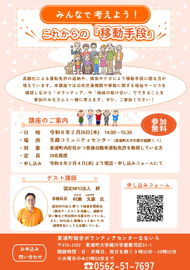 高齢化による運転免許の返納や、病気やケガにより移動に関する困りごとを抱える方が増えています。本講座では公共交通機関や移動に関する福祉サービスを確認しながら「ボランティア」や「地域の助け合い」でできることを、みなさんと一緒に考えます!